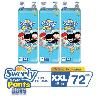 Sweety Silver Pants Boys XL 3x24 is a pants diaper for babies. This diaper uses Diamond Layer Technology (diamond patterned), reduces the risk of liquid coming into contact with the baby's skin and distributes and absorbs liquid extra quickly. Extra elastic and soft waist rubber and thigh circumference Will not leave redness or irritation marks on your little one's skin. Clinically tested by the Australian Dermatologist, halal and BPA-Chlorine-bleach Free certification, making it the best choice for mothers and babies READ THE FULL REVIEW OF SWEETY SILVER PANTS BY MOMS ORAMI HERE: Product https://parenting.orami.co.id/magazine/review-sweety-silver-pants/?utm_source=parenting&utm_medium=artikel&utm_campaign=review-commerce&utm_content=review-popok-sweety-silverSpesifikasi Product Type: Baby Diaper Model: Pants Type: Silver Boys Size: XXL Packaging: Pack Contents per Packaging: 24 Total Purchase contents: 72 Maximum Infant Weight: > 17kg Benefits Provide comfort when your child is active or sleeping at night Reduce the stress levels of babies who are still wetting Excess Soft Cotton-Like Cover, a layer material as soft as a fabric that touches the soft skin of the baby 360 degree Leak Guard Protection, reducing the risk of leakage due to the active movement of the baby in any position Contains natural aloe vera moisturizer, protects baby skin from dryness and irritation Wider back side, the back of the baby diaper is wider and closes the baby's buttocks so it is more comfortable A layer material as smooth as a cloth that gently touches the baby's skin Extra soft diaper material for the comfort of your child's sensitive skin Clinically tested by Australian Dermatologist Free of harmful content such as BPA, chlorine, and bleach Package Contents 3 pack baby diapers (contents 90 pieces) About Brand Sweety is a baby diaper product since many years ago as a mother solution for the little one who is still wetting without having to bother taking care of it. Sweety's diapers are made from natural materials and are safe to use for babies, even for their sensitive skin. Sweety to date continues to make the relentless innovations needed by babies and mothers.