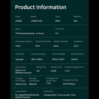 USAMS JY01 TWS Gaming Earbuds-JY Series BT 5.0 *WE WILL OPEN THE PRODUCT PACKAGING FOR QC* SPECIFICATIONS Model : USAMS-JY01 Color : Black Materiot : ABS Version : BT 50 Connection Distance: ≤10m Waterproof : IPX 4 Speaker Diameter : 8mm Impedance : 32Ω Sensitivity: 103±3db Frequency Range: 20Hz-20KHz Earbuds-Approx. Weight : 3.4g x 2 Earbuds Battery: 40mAh Playtime: Approx. 4.5h (Medium Volume) Call Time: 4h Standby Time : ≥ 150h Earbud Charging Time: 1-2h Approx. Charging Case Weight: 325g Charging Case Battery: 38OmAh Charging Time for Case :1-2h Charging Case Size: 55 x 55 x 30mm Low latency : 60ms Compatibility: For Apple/Android devices with BT function Accessories : 1* Type C Charging Cable Pair of spare earbud caps Note: WhatsApp phone pick up mode from tws does not support for Android users, only support for IOS users. Touch Control Mode: Press 1x R/L : Play / Pause / Pick up / Hang up Press 3x : Wake Up Siri Long Press R/L : Reject Call Long Press R : Next Song Long Press L : Prev Song FEATURE 1. BT 5.0 stable transmission 2. Sensitive response 3. Omnidirectional MIC 4. Ultra-clear sound *MANDATORY TO INCLUDE A PACKAGE UNBOXING VIDEO AND CONTACT OUR CUSTOMER SERVICE TO CLAIM WARRANTY OR INCOMPLETE PRODUCT * 12 MONTHS PRODUCT WARRANTY 100% ORIGINAL USAMS PRODUCTS