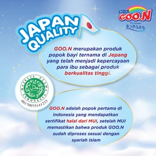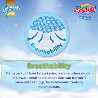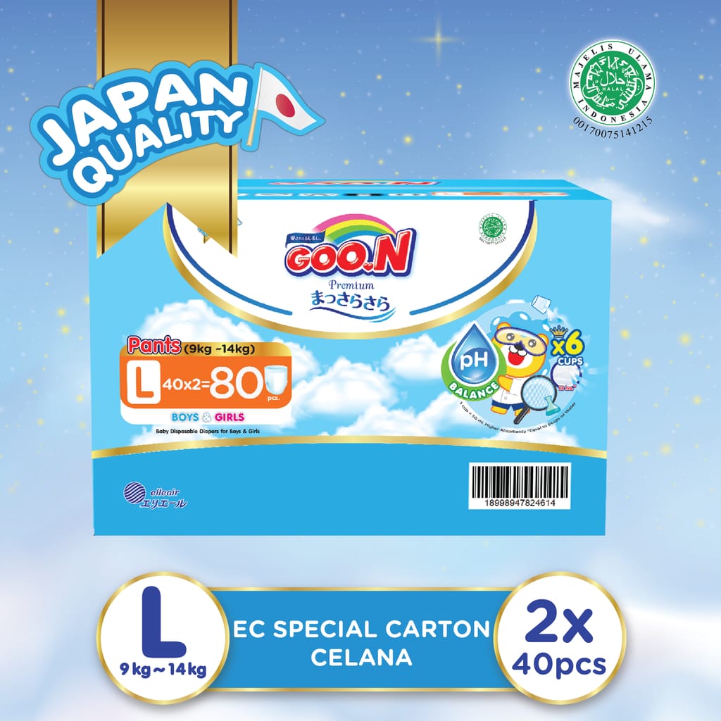 The skin of babies 0-6 months is very sensitive and the fact is that in a day babies urinate every 1-3 hours or as many as 4-6 times a day, so it can cause skin disorders in babies, one of the most common is diaper rash/irritation. Now it's time for you to switch to using Goo.N Premium Pants Massara Sara EC Special Carton (L 40*2 pack). This disposable diaper has 2 Steps Blocks technology (2 side leak arresters) Ultra-soft corrugated surface and extra absorbent pads make it very comfortable to use all day long Absorbs up to 6 cups (12 hours) to keep diapers dry and prevent irritation Product Specification Product Type: Baby Diapers Model: Pants Variant: Massara Sara Size: L Weight: 9 – 14 kg Packaging: Carton Fill: Per Carton: 2 Pack Per Pack: 40 Diapers Benefit Absorbs fluids quickly so that your little one is always comfortable in activities Reduces the stress level of babies who are still wetting Excess Gentle Soft (3D dot emboss) technology is a very soft layer and can prevent irritation Breathability technology (a porous layer found on the entire surface of the diaper) Has Indicator Line technology, peep indicator line Made of very soft material so it is comfortable to use in every movement of your little one Already has MUI Halal Certification Made with the attractive Cuties Design Wonderlion Package Contents 1 carton of Baby Diapers (contains 2 packs) About the Brand Under the auspices of Elleair, GOO. N is a well-known baby diaper product in Japan that has become the trust of mothers as a high-quality product. In Japan, the name GOO. N itself means growing well and actively. In Japan, the name Masara sara itself means a smooth and dry surface. Therefore, GOO. N Masara sara never stops trying to improve its quality so that mothers are known as diapers that have a smooth surface and stay dry that can protect the baby's skin so that your baby can grow well and be active with Goo.N. Now GOO. N has introduced its products to the Indonesia market, where mothers in Indonesia can also experience the advantages of GOO baby diapers. N that other diaper products do not have.