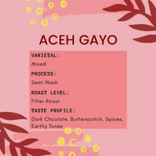 Aceh Gayo Grade 1 Coffee Beans 250gr nett Roast Level: Filter Roast Profile: Dark Chocolate, Butterscotch, Spices, Earthy Tones Region: Gayo Highlands, Aceh Altitude: 1300- 1500 MASL Process: Semi Wash Varietal: Mixed Suggested Brewing Method: - French Press - Pour Over - Aero Press - Brewer Filter Packing : Flat-Bottom with Zipper Before pressing the Buy / Cart button, please select first in the SECTION VARIAN / RASA Type of coffee: - COFFEE BEANS - ROUGH GRIND - MEDIUM MILL - FINE GRIND For more specifics, it may be added in the record at the time of order for the seller COARSE MILL (Cold Brew, French Press) MEDIUM MILL (V60, Filter Brewer, AeroPress, Syphon) FINE GRIND (Tubruk, Espresso, Vietnamese Drip)