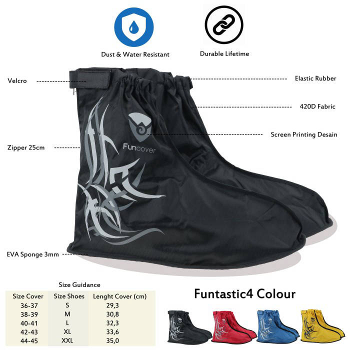 Stock Ready : Black : S , M , L, XL, XXL Red : S , M, L, XL , XXL Blue : S , M , L , XL , XXL message other than the above color sent ready ya:D MUST WRITE SIZE & COLOR ORDERED YES so that bs sent kl ga written yes we do not send because ga know what ordered :P~ Ready All Size Black / Red / Blue Example: XXL Red , Blue , Yellow [So Priority Red then Blue then yellow if the front one is empty] Or COntoh : XXL Blue kl no cancel [So must be blue] advantages of shoe suits: 1. Protect your shoes/ feet from getting wet 2. Easy to carry because it is light and can be entered into your motorcycle/car seat 3. NOT EASILY TORN 4. NEAT Stitching 5. Rubber base so that it is not slippery in wet or dry conditions 6. Available in 5 Sizes S for shoe size 36-37 M for shoe sizes 38-39 L for shoe sizes 40-41 XL for shoe sizes 42-43 XXL for shoe sizes 44-45 7. Available In 3 Colors Black Blue Red You don't have to be afraid of RAIN disrupting the comfort of your trip anymore As our recommendation for the use of JAS SEPATU to SHOES: *Fantofel : Can fit shoe size *Booth : 1 or 2 numbers above normal shoe size *Sneakers : 1 number above normal size or according to normal size