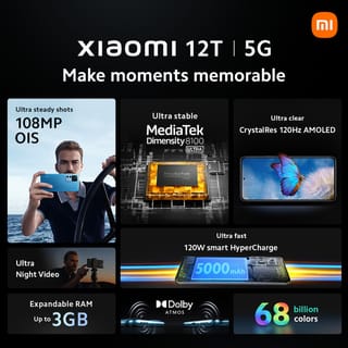 Xiaomi 12T 5G Warranty Period : 24 Months Xiaomi Official Store Official Warranty, Official IMEI Registered in IMEI Ministry of Industry With an ultra-clear, high-resolution 108MP OIS main camera, this smartphone setup is equipped with a variety of optical upgrades and best-in-class night features to enhance your experience day and night. Equipped with the best MediaTek Dimensity 8100-Ultra 5nm processor and the largest cooling system ever in the Xiaomi T Series, this phone is ready to make your wishes come true faster, smoother, without overheating quickly. The battery lasts for an entire day in just 21 minutes. The time required to prepare and enjoy espresso. HyperCharge 120W, fully charged in 21 minutes*. The battery has a capacity of 5000mAh. 42 safety features and 9 thermal sensors, which protect the connector to the port and battery, and guarantee 800 charge cycles. Meet our first AMOLED CrystalRes display, which will take you immersed in the beauty of the moment. The crystal-clear screen with dual Dolby Atmos stereo speakers is here to capture your best moments. 6.67" CrystalRes AMOLED display. Super resolution of 1220p, contrast ratio of 5,000,000:1, and pixel density of 446 ppi. Although this screen has a 27% higher clarity level than a 1080p screen, the power consumption remains the same. The dual Dolby Atmos speaker setup delivers solid stereo audio that is even more pleasing to the ears. Movies and music will sound more exciting thanks to high-quality clear audio. Package Contents: Xiaomi 12T Adapter USB Type-C Cable SIM Opening Tool Protective Case Quick Start Guide Warranty Card Hi Mi Fans, For the convenience and safety of shopping. Please help us. 1. Include an unboxing video when complaining 2. Record videos clearly before opening the package 3. Sorry, we do not accept videos recorded after the package has been opened as well as edited or intermittent videos 4. Don't forget to give reviews and star rates