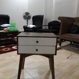Minimalist nightstand table Natural wood finishing and combined with duco paint (for drawers) Wood original material (solid and strong and durable) Modern minimalist design, very suitable for desk in room or terrace table etc. Pj size 50cm lbr 30cm height 55cm Finishing/color: -light brown drawer white paint -dark brown drawer white paint -full light brown -full white