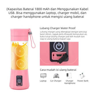 GM Bear Portable Blender 6 Blades CAN DIRECTLY DRINK + FREE BUBBLEWRAP! Please READ THE PRODUCT DESCRIPTION FOR THE CORRECT WAY OF USE PORTABLE BLENDER / JUICER Suitable for picnics, sports, to the office, school or just back to date though! With this tool you can make juice anywhere and anytime you want! PRODUCT SPECIFICATIONS Material : Food Grade PP Sharp Blades : 304 Stainless Steel Capacity: 380ml Net weight: 392gr Box Size: 8*8*24cm Power source: USB Cable Motor: DC 3.6V Battery Capacity : 1800MAH 3.7V Battery Charging : 3 Hours to 8 - 10 times Juice (Optimal Destruction even for Ice Cubes) 1. Lightweight and portable, easy to install and easy to clean; 2. Average juice processing speed of 10 seconds; 3. Glass made of borosilicate glass of the best quality for safer and higher temperature protection; 4. When it is charging, it can turn off automatically to prevent overcharging; 5. Just DOUBLE PRESS THE POWER BUTTON TO start the blender 6. Close very tightly, leakproof; 7. Large capacity battery: 1800mAh Warning: 1. Do not turn on if the blender is empty (Hazard). 2. Do not use a blender when charging (As a result the Battery Leaks). 3. Do not press the power button if the blender cup is not connected properly. 4. Do not put any water or liquid on the base, keep it dry (May Damage Battery and Machine). 5. Keep away from children when not in use. 6. Do not store in the freezer 7. Do not put hot water in 8. Do not place in the microwave How to Use 1. Connect the cup and base correctly. 2. Put pieces of fruit or vegetables in a bottle then pour milk or water until filled 80% of the container. 3. Make sure the cup is tightly closed and THEN DOUBLE PRESS THE POWER BUTTON. 4. If it is felt that enough is enough, THEN SIMPLY PRESS the power button once 5. A cup of delicious fresh juice is ready to be served.