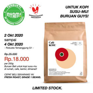 Thank you Toppers for supporting us and making us one of the NYAM products in Tokped! With that, we will hold a special promo for you with a discount price for our temanggung robusta coffee beans that are freshly roasted every day! The discount is very attractive! limited time only! From the normal price of Rp.25,000 for the 250g size, it is now only Rp.18,000!!!! Only for the period from October 2, 2020 to October 4, 2020, guys! And also don't forget to support and vote for us as your choice! Thank you very much! #supportus #supportkopilokal #supportIndobevmo #banggabuatanIndonesia #kopiEsKopiSusu #KopiRobustaSusuGulaAren #RobustaItuEnak #kopiIndonesia ! Vote for us below! Every vote counts for us! https://tokopedia.link/D0ZcEDsjS9 https://tokopedia.link/D0ZcEDsjS9 Hurry up guys!! Recipe Link on our youtube channel! https://www.youtube.com/watch?v=QpQrtCWbm9w PREMIUM QUALITY, CONSISTENCY AND GUARANTEED PRICE. ROBUSTA ESPRESSO BLEND FOR COFFEE SHOPS OR MAKE ICED COFFEE MILK, VIETNAM DRIP ETC. COFFEE BEANS ARE SORTED WELL TO GUARANTEE QUALITY. IT CANNOT BE DELIVERED ON THE SAME DAY BECAUSE IT HAS TO BE ROASTED FIRST. THE FASTEST PROCESS IS 1 DAY BEFORE THE NEXT DAY. SO DELIVERY H+1 AFTER THE ORDER IS RECEIVED. TYPE: ROBUSTA ORIGIN: TEMANGGUNG PROCESS: HONEY MIXED VARIETAL ROAST DATE: FRESH FROM ORDER TASTING NOTES: SMOKEY, BOLD, NUTTY, LOW ACIDITY, CARAMELISED BROWN SUGAR. SUITABLE FOR MILK COFFEE PALM SUGAR. HIGHLY RECOMMENDED. FOR MILL SIZES, YOU CAN SEE IN THE GUIDE PICTURE OR: ROUGH GRINDING | COARSE - FOR FRENCH PRESS, COLD BREW. MEDIUM GRINDING | MEDIUM - FOR AEROPRESS, V60, KALITA, DRIP, SYPHON. FINE GRINDING | FINE - FOR MOKAPOT, TURKISH, FIRE SHIP STYLE.