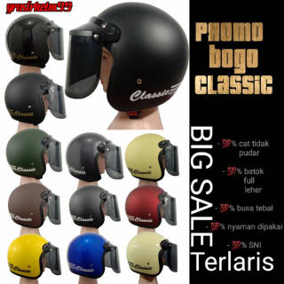 promo helm bogo classic - price includes flat glass trampled / convex - size all size adult FIT to L - Paint does not fade easily - thick foam - full neck shell - SNI - current model It has been done QC before the delivery process, and can be sure the goods we send are in good condition / not defective! NB: add extra packing dus as a store warranty medium! When you don't use extra packing, The store is not responsible for any damages incurred during the delivery process! Happy shopping:)