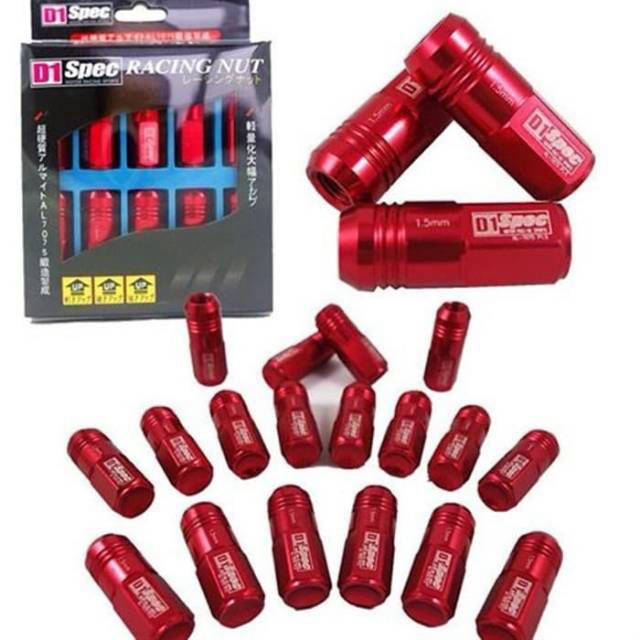 Racing Wheel Bolt D1 Spec 12 x 1.50mm Features * Using material: aluminum billet, lighter and rust resistant than iron. * Finishing: anodized paint * On each bolt, there is printing D1 Spec. * Size: length 50mm, width 25mm. * Bolt size 1.50mm can be used on almost any car: Toyota, Honda, Mitsubishi, Lexus, Daihatsu, Mazda (except Nissan and Suzuki using M1.25 bolts) * Weight per bolt: 25gr Ready RED(READY) 1 SALES PACKAGE contains: - 20 pcs bolt 12 x 1.5 MM - no adapter key, can use regular key MAKE SURE THE BOLT SIZE IS RIGHT ON YOUR VEHICLE