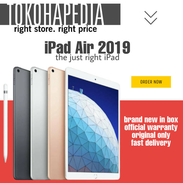Welcome to Tokohapedia LINE @tokohapedia About Us : https://www.tokopedia.com/tokohapedia/review NB: There is a physical take, just for complaint help Address : ITC FATMAWATI Lt.Dasar APPLE PENCIL 1 : https://www.tokopedia.com/tokohapedia/ready-stock-bnib-apple-pencil-for-ipad-pro-garansi-1-tahun KEYBOARD 10.5" 2019 : https://www.tokopedia.com/tokohapedia/apple-smart-keyboard-for-ipad-pro-10-5-inch-2019-garansi-apple Specifications - iPad Air 3 2019 : 10.5" Inch Retina Display - Color Variant: SILVER / GOLD / SPACE GREY - SSD / Memory : 64GB/256GB, 3GB RAM - Apple A12X Bionic (7 nm) - GPU : Apple GPU (4-core graphics) - CPU : Hexa-core (2x2.5 GHz Vortex + 4x1.6 GHz Tempest) CHECK GENUINE GOODS & OFFICIAL WARRANTY : checkcoverage(dot)apple(dot)com PAY = AGREE Culture Read before buying, the goods we sell according to the advertisement according to the description PRODUCT: 1. GUARANTEED GOODS BRAND NEW IN BOX + SEAL 2. Genuine Goods from Apple Store (not original 100% money back) 3. APPLE Inc. 1 Year WARRANTY (FREE CLAIM DEPOSIT) 4.WARRANTY 7 days direct exchange (since the goods are received) TOKOHAPEDIA : 1. Orders are shipped on the same day, after the order is received 2.OUTSIDE JAKARTA - JNE YES / TIKI ONS 1 Day to 3. JAKARTA - Choose GOJEK to be replaced by OUR COURIER, because it is prone to loss (Mechanism can be asked directly) ARBITRARY..?? 1. Accept Split Payment (price will be made according to the limit, lack of transfer) 2.RESELLER Special Price (Next Order) 3. Purchase more than 1pcs NEGO price 4. Purchase with invoice memorandum to facilitate the warranty claim process 5.Markup Memorandum please info us